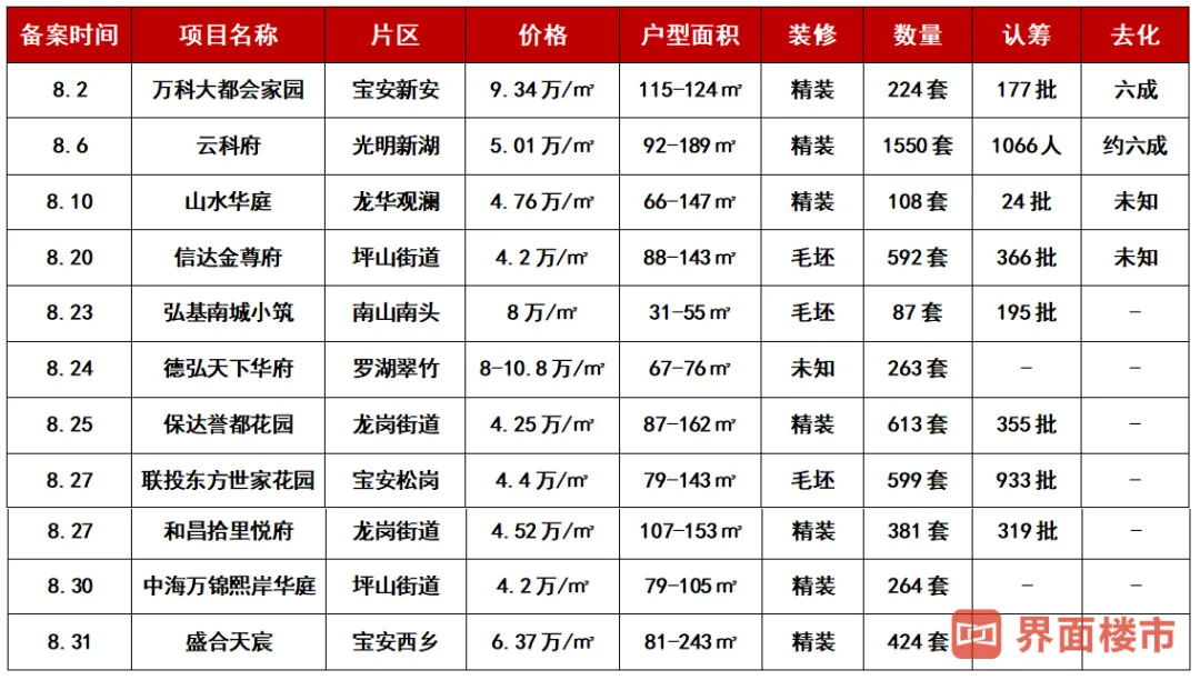 据深圳中原研究院数据,8月开盘的项目,整体去化率约在4成左右,是今年新盘去化成绩最差的一个月。