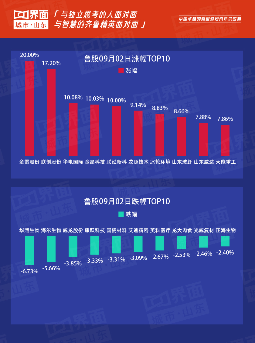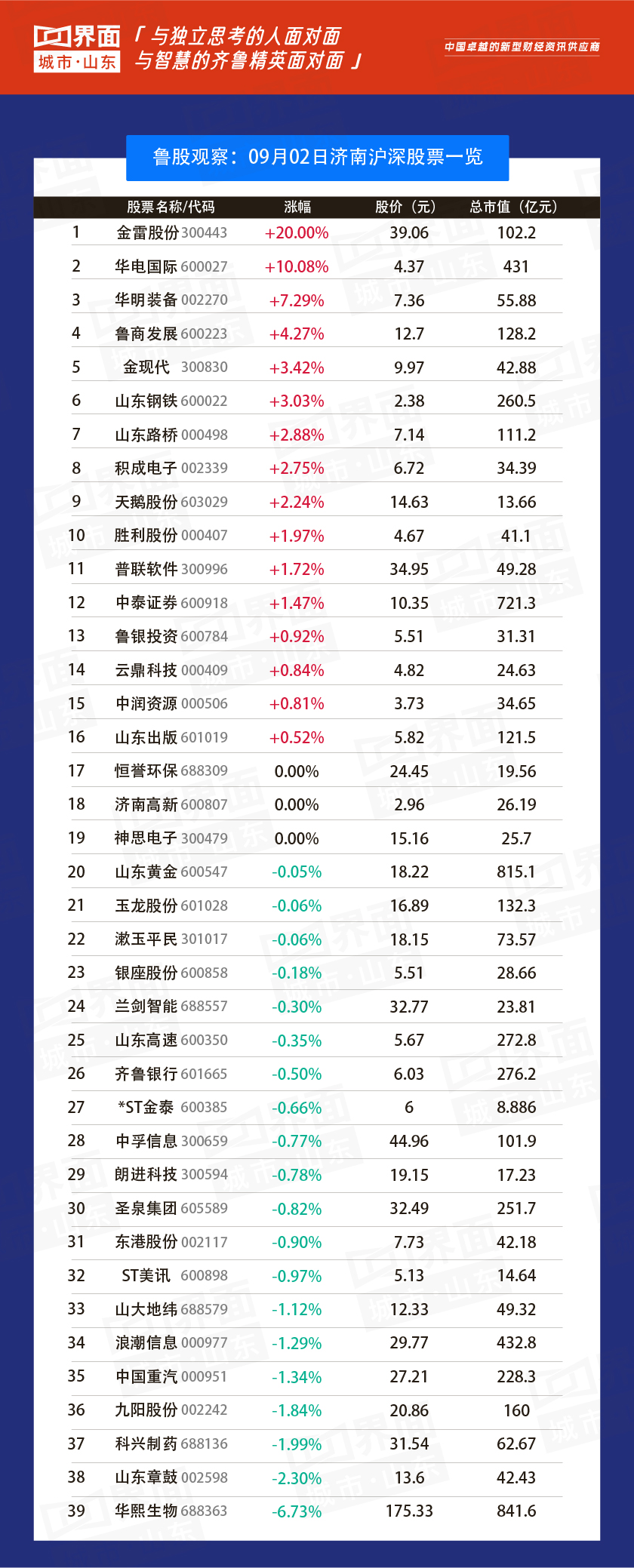 济南市涨幅榜首:金雷股份(300443),涨幅20.00%,股价39.06元,总市值102.2亿元;