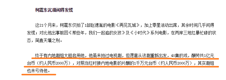 柯震东在此之前从未演过电视剧。目前出现的一些通稿显示,唯一能聊以慰藉的可能就剩下酬劳了,40集2000万人民币,对比当红时电影片酬也是2000万,“其实剧组也未亏待他”。