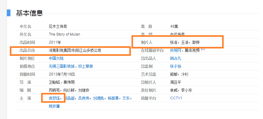 总结下来,就是侯梦瑶出演女一号的三部电视剧,投资方、发行方中都有“东阳江山多娇文化传媒有限公司”,“北京中视精彩影视文化有限公司”则出现了两次。而“郭桦”在三部剧中均为“制片人”。