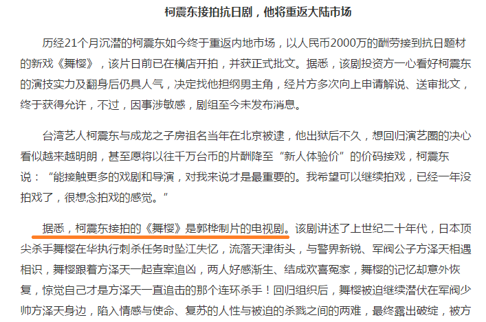 因为有广电总局公告的备案信息,所以河南电影电视制作集团参与柯震东新剧《舞樱》,应该是板上钉钉的事。也正是因为其国企的背景,为柯震东抹掉“污点”背书,也在情理之中。
