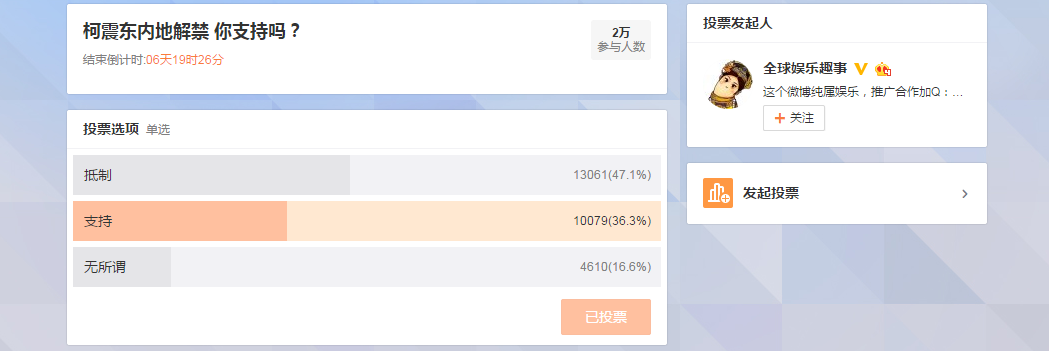 随后,#柯震东内地解禁#迅速登上微博热搜榜。还有人发起了“柯震东内地解禁 你支持吗?”的投票活动,不过,娱乐大咖内参(微信公众号ID:yulebiggie)在参与人2万的时候截图,结果好像不怎么乐观。