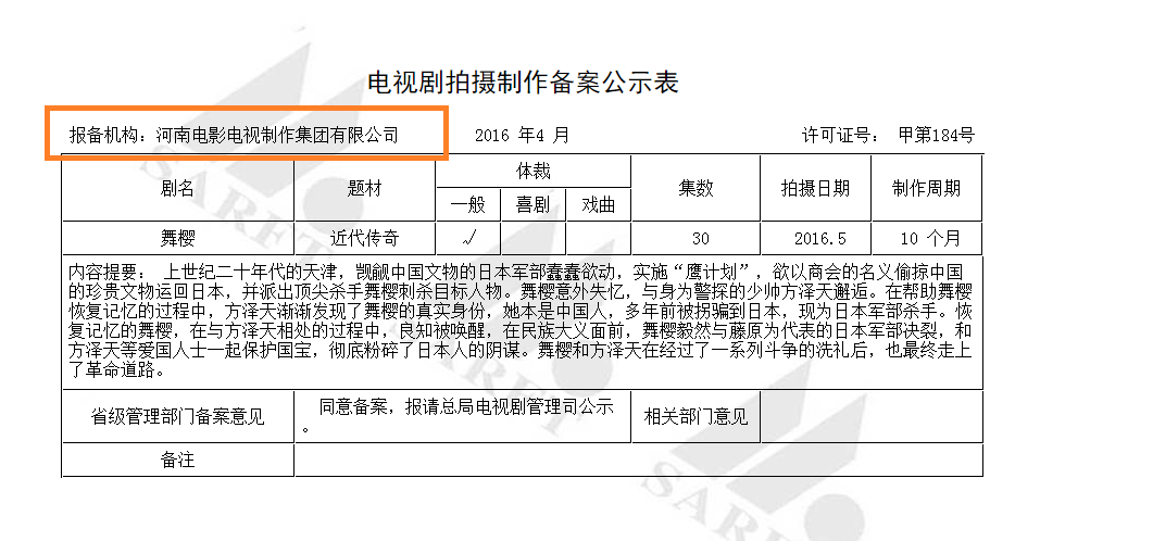 想要知道谁“相中”柯震东出演抗战剧《舞樱》并不难。实际上,广电总局在今年4月份就已经公示了这部剧的一些信息。河南电影电视制作集团有限公司是这部剧的报备方。