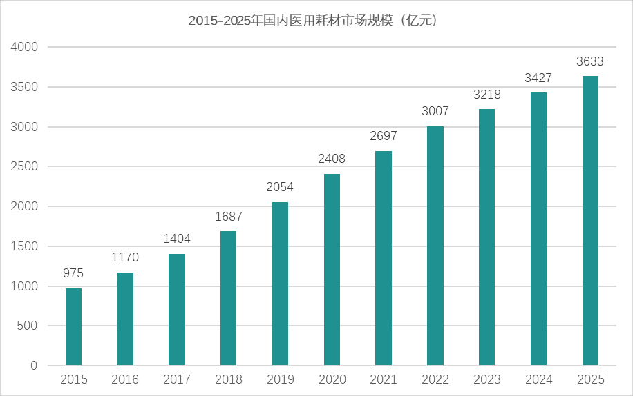 根据《2021-2026年中国医用耗材行业市场现状与投资前景调查报告》,国内医用耗材规模将会达到3633亿,而Freedonia则预测,到2025年全球绷带及医用敷料市场规模将达到313.00亿美元。