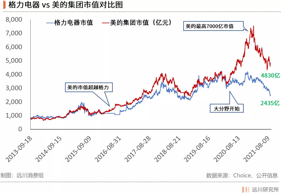 2020年初,两家公司的市值都在4000亿元左右,但之后便开始了市值的大分野,格力一路向南,美的一路向北。即使美的在原材料上涨的背景下相比跌了30%,美的如今的市值,仍然比格力多一个海尔(2600亿)。