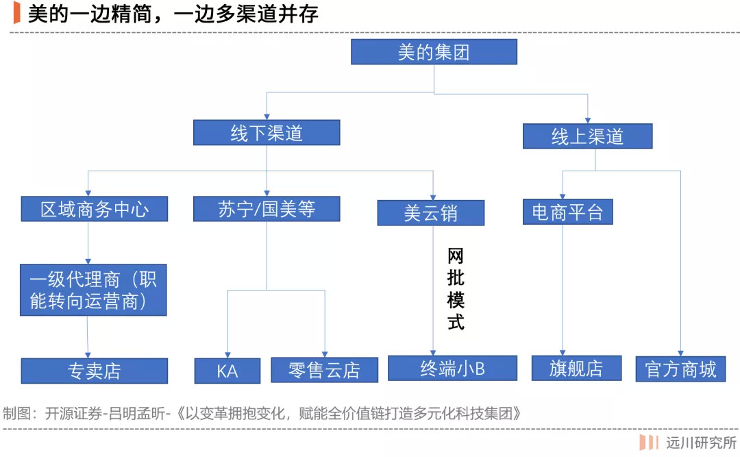 美的的减法则在于,取消了原来的二级代理,把销售模式精简为“集团-合资销售公司-经销商-零售商-消费者”。到了2018年,美的祭出“网批模式”,进一步精简渠道。