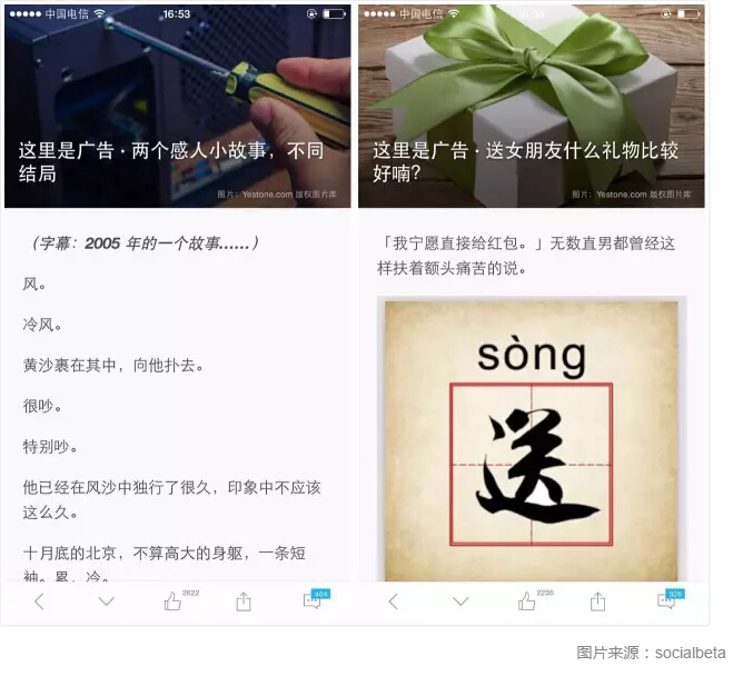 以及接下来的文章:《两个感人小故事,不同结局》、《送女朋友什么礼物比较好》,广告主都是英特尔。