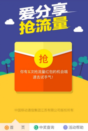 2、产品概述:活动期间,参与活动的客户每天只有1次抽奖机会,登录掌厅客户端活动专区参加抽奖。抽奖有机会获得流量包,抽中流量包后需分享赠送给好友(赠送号码和被赠送号码需同一地市的移动号码)使用,自己无法使用,好友必须在活动期间进入客户端活动专区领取流量,成功领取后3个工作日内开通,开通成功后仅限当月使用,月底自动失效。每月每个用户只能向同一个号码赠送一次流量包,活动期间每个号码最多被赠送三次流量包。