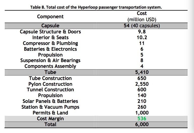 如果这个费用准确,则远远低于高铁的基建费用。据财新网报道,以中国为例,京沪高铁投资2209亿元,而由于举债修建,每年融资利息就高达百万元。马斯克在论文中计算的这个费用折合人民币约400亿。而被埃隆·马斯克在论文中极大挖苦的加州高铁,总投资预计680亿美元,几乎是超级高铁的十倍不止。