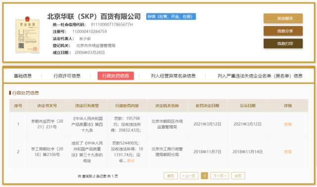 据国家企业信用信息公示系统显示,北京华联(SKP)百货有限公司在2018年、2021年曾收到两封行政处罚决定书。