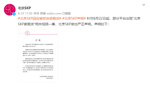 8月25日,北京SKP通过官方微博对“售假”一事进行回应,称为顾客提供更好的购物体验和高标准的服务一直是北京SKP坚守的准则。北京SKP一向合法诚信经营,高度重视客户体验,商品质量和顾客服务一直是北京SKP的首要关注焦点。北京SKP对于任何制假售假行为一贯实行“零容忍”。