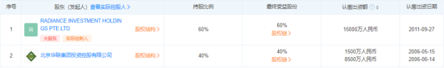 据天眼查显示,SKP主体运营公司为北京华联(SKP)百货有限公司,成立于2006年,注册资本达2.5亿元,RADIANCE INVESTMENT HOLDINGS PTE.LTD.拥有后者 60%的股权,北京华联集团投资控股有限公司持股40%。