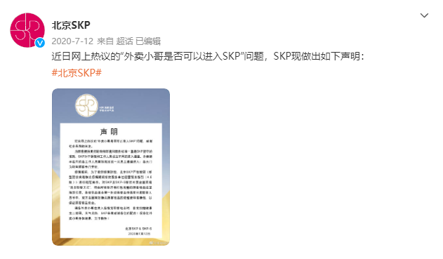 2020年7月12日,北京SKP对“外卖员是否可以进入SKP”发表声明予以回应,北京SKP称为顾客提供更好的购物环境和服务标准一直是SKP坚守的准则,SKP对于顾客和工作人员设立不同的进入通道,外卖骑手在内的各工作人员需按规定统一从员工通道进入;各大门为所有顾客专门开放。