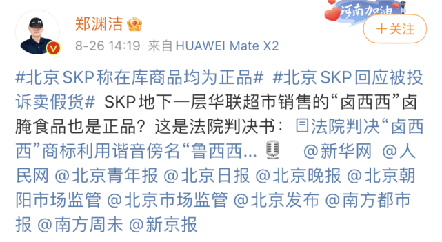 8月26日,知名作家郑渊洁转发北京SKP的声明微博,对SKP地下一层华联超市销售的“卤西西”卤腌食品是否为正品提出质疑,并晒出法院判决书。