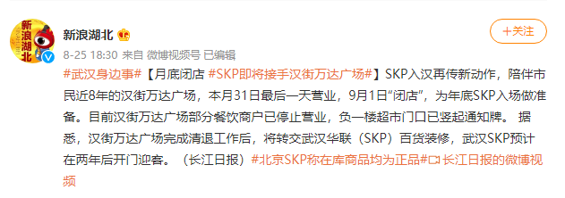 据悉,今年8月31日,汉街万达广场最后一天营业,相关商铺也摆放起通知牌,完成清退工作后,汉街万达广场将转交武汉华联(SKP)百货装修,并预计花费两年左右的时间而后正式开业。