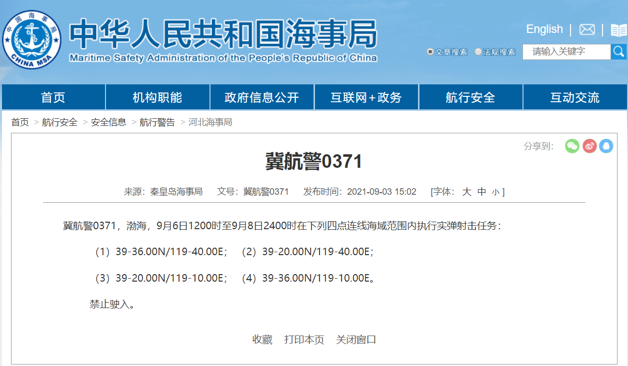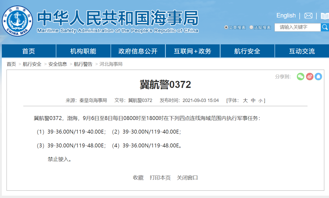 秦皇岛海事局:9月6日至8日渤海部分海域执行军事任务