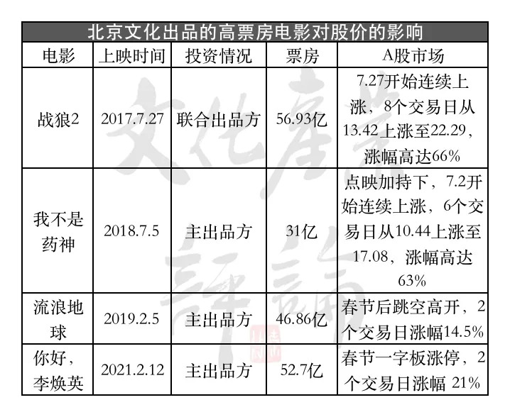 至此,北京文化“爆款制造机”的名号彻底打响,而随着高调保底的还有票房与股价的共振。