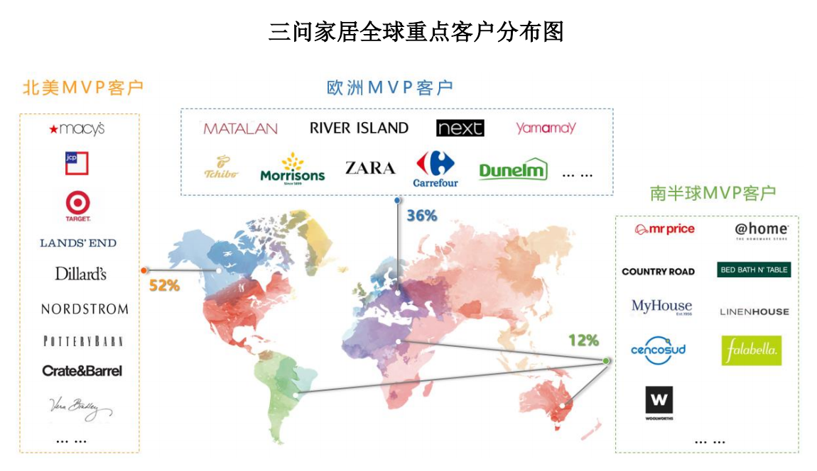 三问家居则是以原创设计为核心竞争力的服务型贸易商,定位为“做全球客户与供应商最有价值合作伙伴”,为全球中大型零售商和中高端品牌商提供特色家用纺织品、家居服饰和特色面料产品,具体包括客厅场景的靠垫、毯子、披巾,卧室场景的床品、浴袍、睡衣,以及家居休闲服、运动休闲服、配饰等。其客户遍及美国、英国、瑞典、澳大利亚、南非、日本、韩国等30多个国家和地区,为Target,Matalan,Nordstrom,Barefoot Dreams,Vera Bradley等全球超过190家中大型零售商和中高端品牌商客户提供相关产品。