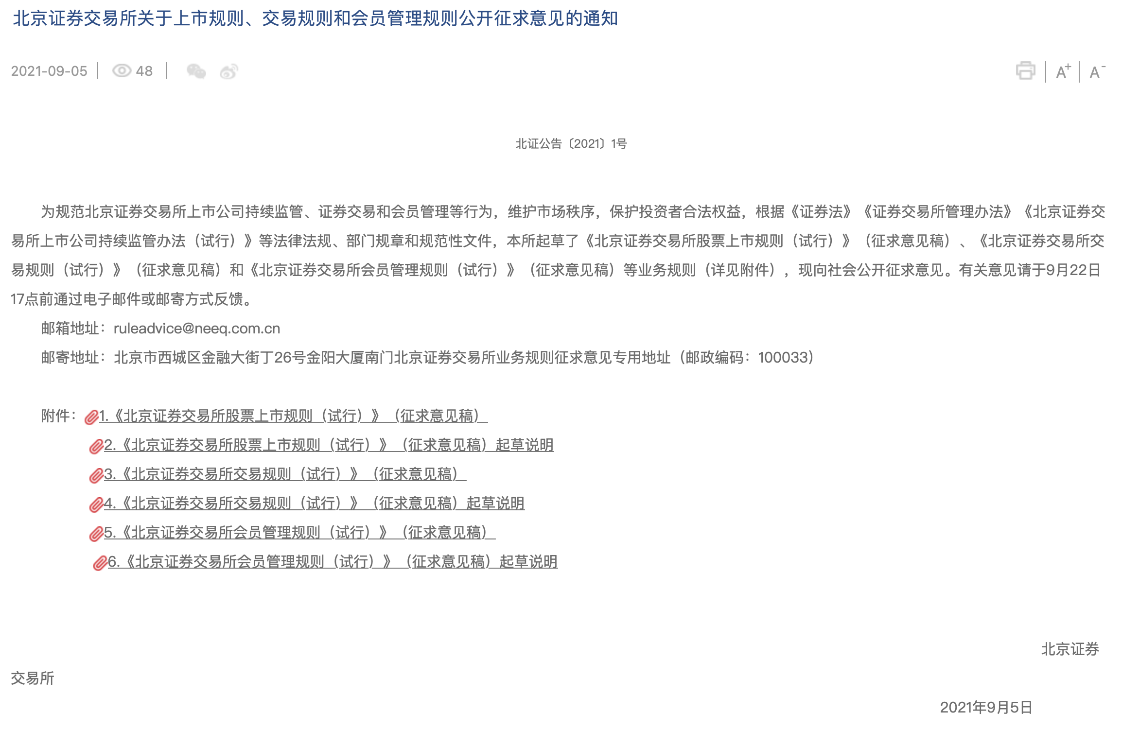 9月5日消息,为贯彻落实习近平总书记关于“深化新三板改革,设立北京证券交易所”的重要指示精神和党中央、国务院的有关决策部署,在中国证监会指导下,北京证券交易所(以下简称北交所)起草了北交所自律监管相关业务规则,自2021年9月5日起陆续向市场公开征求意见。