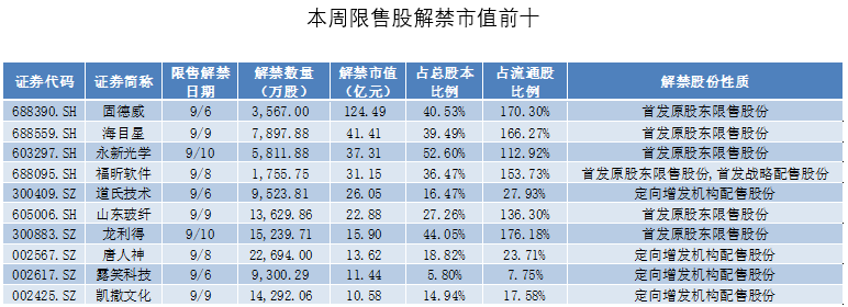 主要产品为激光设备的海目星(688559.SH)也将迎来首发限售股的解禁。根据公告,公司将于9月9日有7897.88万股限售股解禁上市,约合解禁市值41.41亿元。
