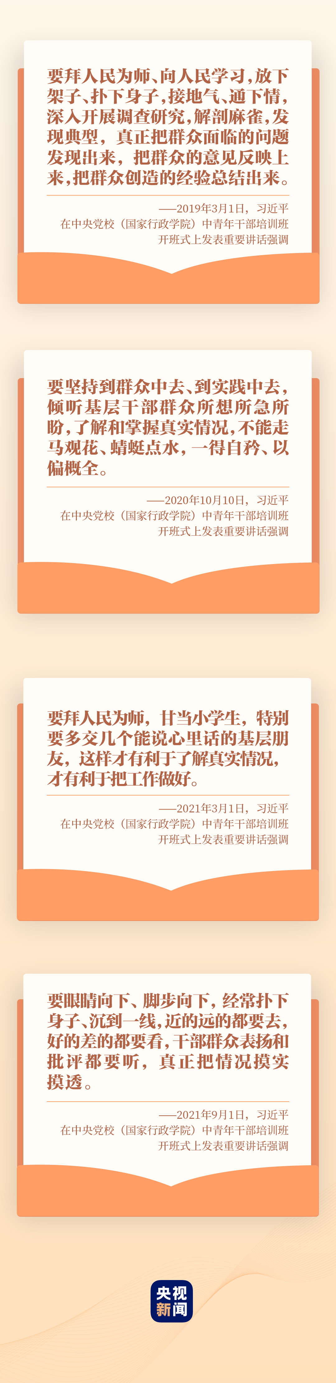 “坚持从群众中来、到群众中去,真正成为群众的贴心人” “既要‘身入’基层,更要‘心到’基层”“掌握调查研究这个基本功”……2019年以来,习近平总书记在中青年干部培训班开班式上多次要求干部拜人民为师,深入基层开展调查研究。