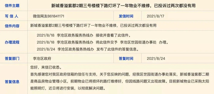 2021年8月24日,李沧区政府对此做出了答复:经我区世园街道办事处落实,新城香溢紫郡二期是商品房物业管理小区,前期物业已将损坏的路灯维修好,但因线路问题又出现故障。目前新城物业已采购太阳能照明灯,近日将进行安装,以彻底解决问题。