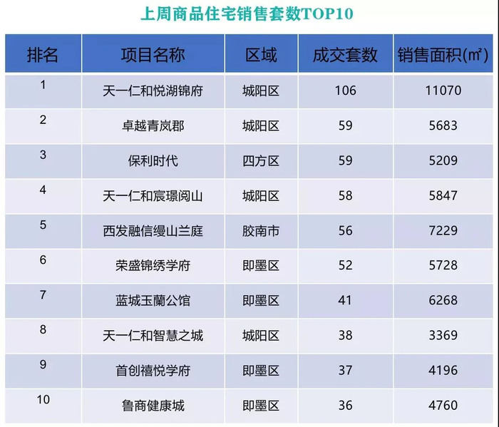 区域成交榜第三名胶州市单周成交量449套,成交面积53919㎡。另外,上周即墨区有4个项目登上单盘销售top10,其中,荣盛锦绣学府上周成交52套位列单盘榜第6名;蓝城玉蘭公馆上周成交41套位列单盘榜第7名;首创禧悦学府上周成交37套位列单盘榜第9名;鲁商健康城上周成交36套位列单盘榜第10名。