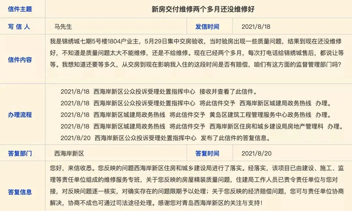2021年8月20日,西海岸新区对此做出了答复:经落实,该项目已由建设、施工、监理等责任单位组成的维修服务专班,关于您反映的房屋精装质量问题,住建局工作人员已责令责任单位与您对接,对反映问题逐一核实,对确实存在的问题限期予以处理;关于您反映的经济赔偿问题,您可与责任单位协商解决,协商不成也可通过司法途径处理。