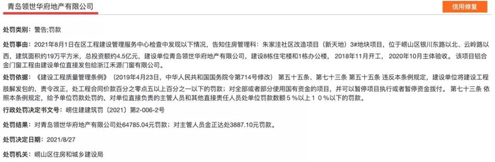 对此,崂山区住房和城乡建设局对青岛领世华府地产有限公司处64785.04元罚款;对主管人员金正达处3887.10元罚款。