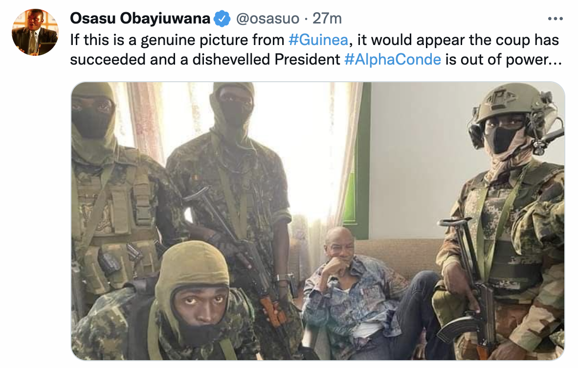 报道称,总统被Mamady Doumbouya上校领导的特种部队抓获。据称,叛乱分子还扣留了一些高级官员。网络上还流出了疑为“孔戴被拘”的照片和视频。