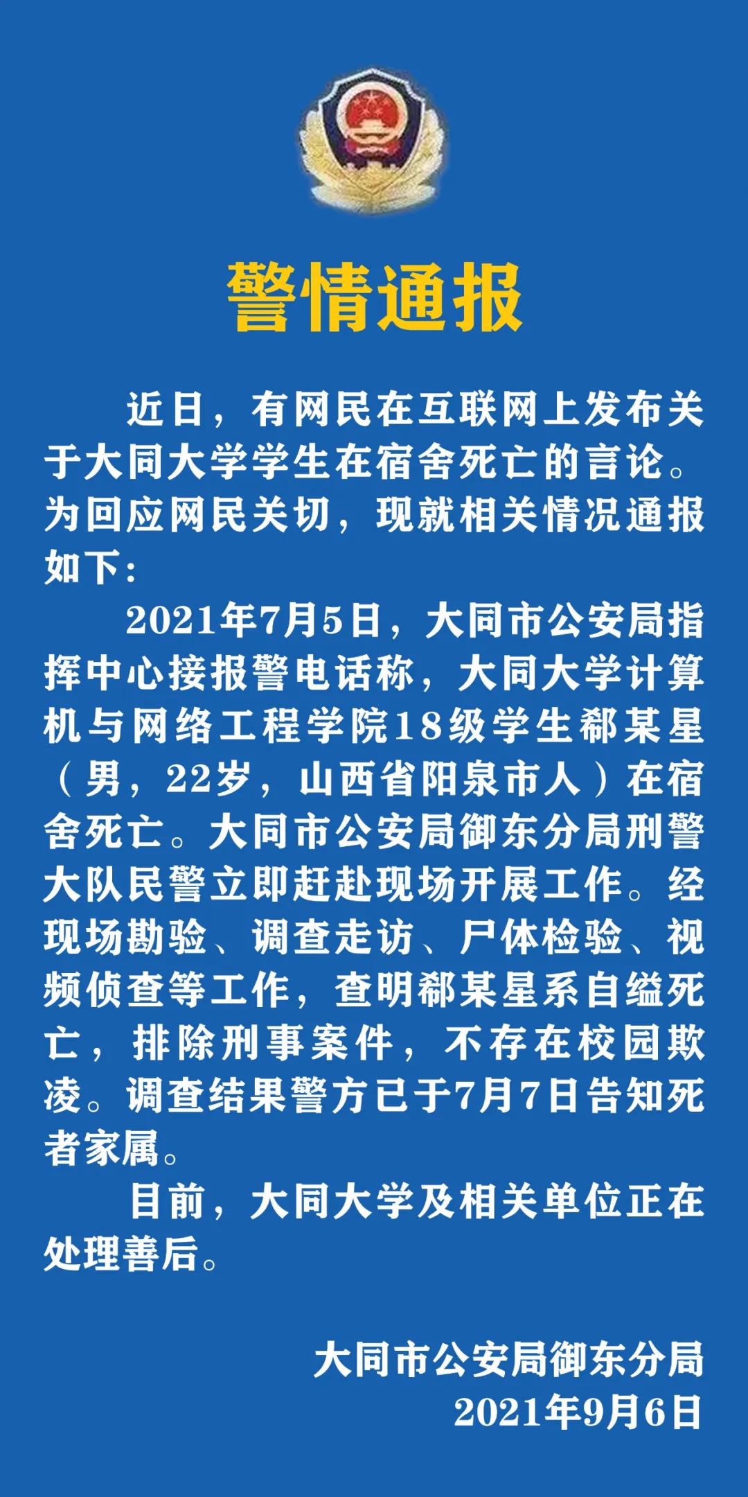 据“大同公安”微信公众号消息,近日,有网民在互联网上发布关于大同大学学生在宿舍死亡的言论。为回应网民关切,现就相关情况通报如下: