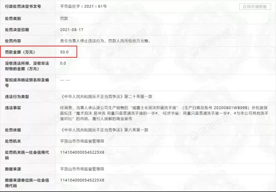 近日,信用中国发布信息显示,威露士一款抑菌洗手液因发布引人误解的商业宣传,其母公司威莱(广州)日用品有限公司(下称威莱公司)被河南省平顶山市市场监督管理局罚款50万元。值得注意的是,近期,宝洁、纳爱斯等多家日化企业均被平顶山市监局开出罚单。