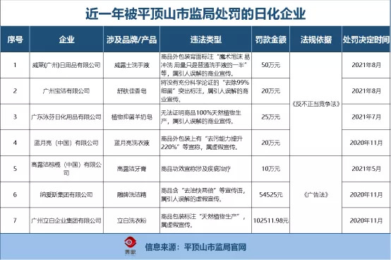 据青眼不完全统计,自2020年11月,平顶山市监局已对7家日化企业开出罚单,除上述企业外,还有高露洁棕榄(中国)有限公司(下称高露洁)、纳爱斯集团有限公司(下称纳爱斯)、广州立白企业集团有限公司(下称立白)和蓝月亮(中国)有限公司(下称蓝月亮)等知名企业。