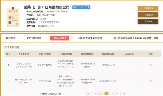 此外,2021年2月,威莱公司也曾因不合规行为导致的安全生产事故,被广州市从化区应急管理局处以罚款27万元。5年内,威莱公司先后因违法了《广告法》《安全生产法》《反不正当竞争法》共计被罚78万元。