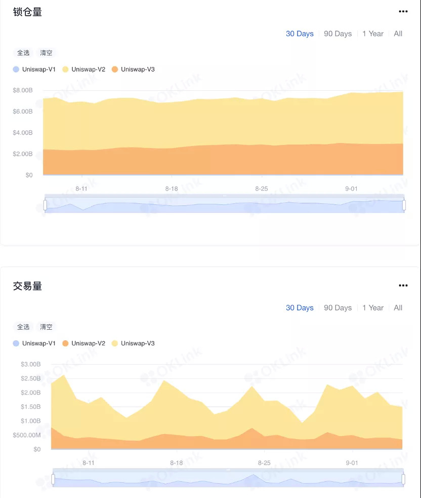 欧科云链OKLink数据显示,截至9月4日,Uniswap V1+V2+V3的加密资产锁仓总额(TVL)超77.45亿美元,当日交易量超15.53亿美元,尽管UNI价格受监管消息影响下跌,但TVL数据未有明显流失,交易量也仍处正常的波动范围,两项指标仍然让Uniswap头顶以太坊链上“最大DEX”的王冠,如今这个王冠或许给它带来了监管麻烦。