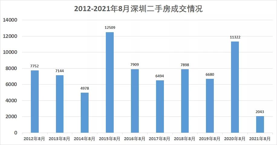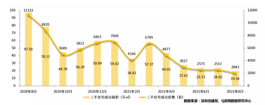 据深圳住建局公布的数据,2021年8月,深圳二手住宅成交套数为2043套,环比下跌20.10%,同比下跌81.96%;成交面积19.54万平方米,环比下跌18.65%,同比下跌79.96%。