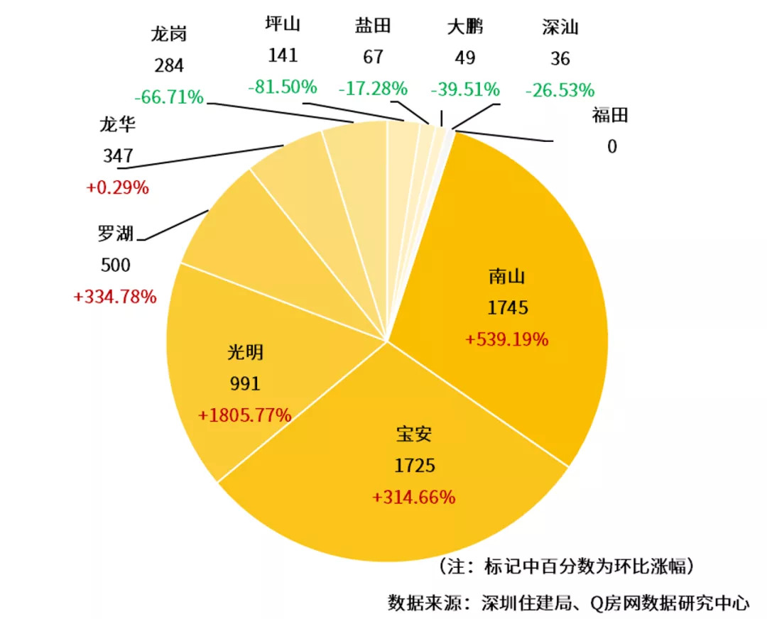 细化来看,6大主要大区的成交量都呈现环比下跌的情况,其中,宝安跌幅最高,达到30.9%;跌幅最低的盐田,也环比下降了11.6%。