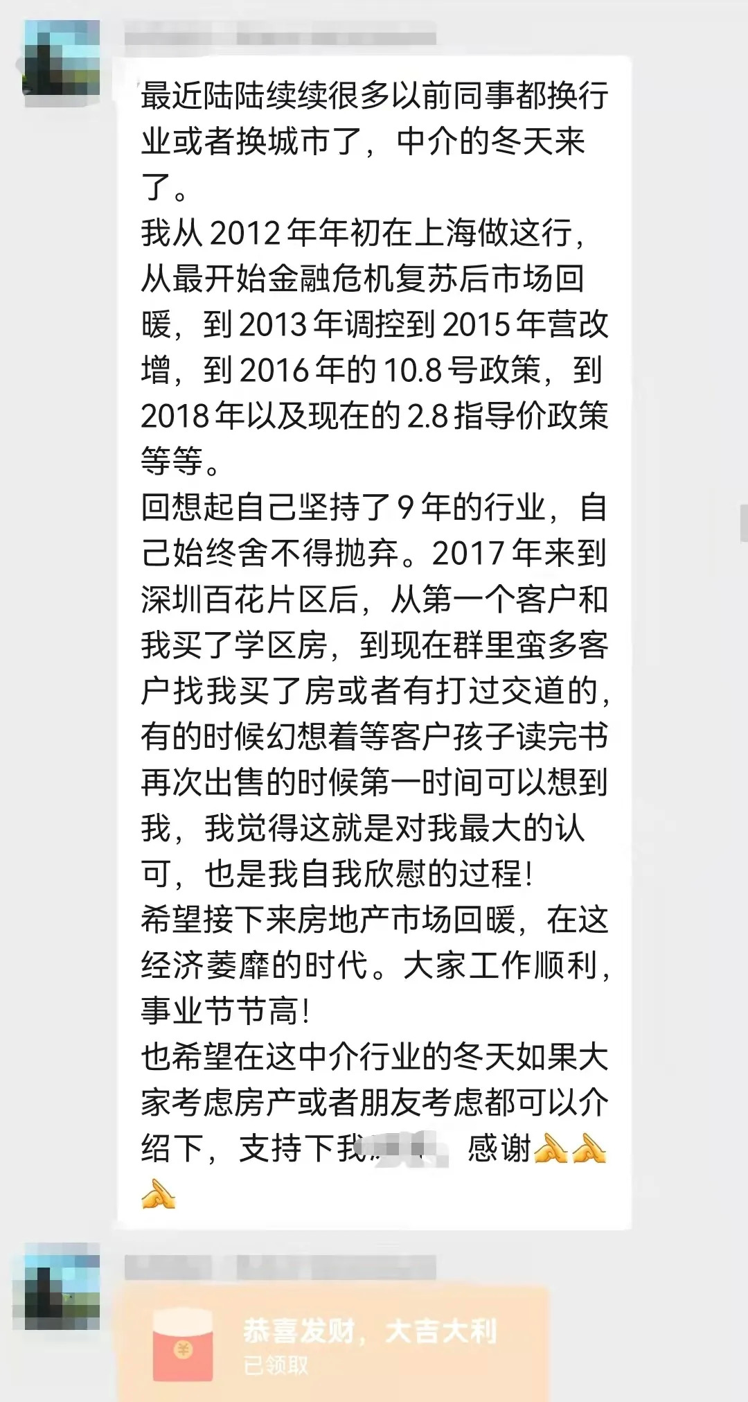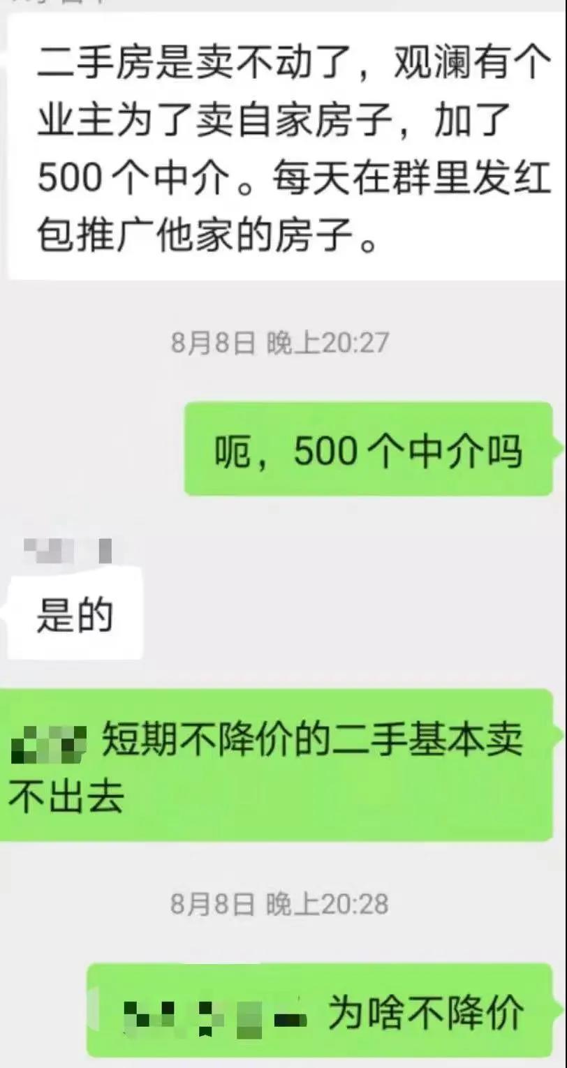 此前媒体爆料称,有业主为了卖掉房源,不惜拉一个500人的中介群,每天在群里发红包,希望他们能尽快帮自己卖出房子。
