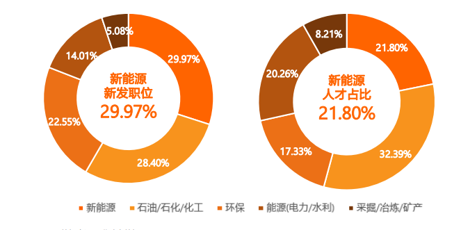 报告显示,近一年新能源行业人才需求量持续上升,新发职位在“能源·化工·环保”大行业的占比近30%,同比增长4.4个百分点,人才占比也达到21.8%,在“能源·化工·环保”大行业中排名第二。