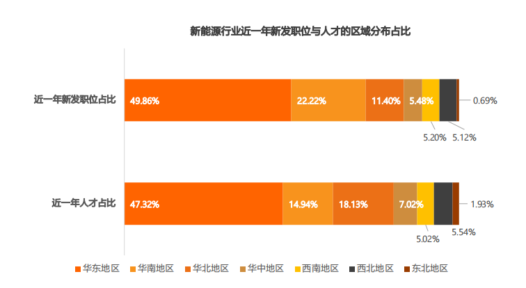 而此次报告也显示,新能源行业的新发职位和人才分布则出现了往华东、华南和西南聚集的现象,这和近一年的新能源企业发展与项目规划方向有一致性。