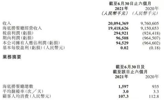 海底捞2021年上半年财报