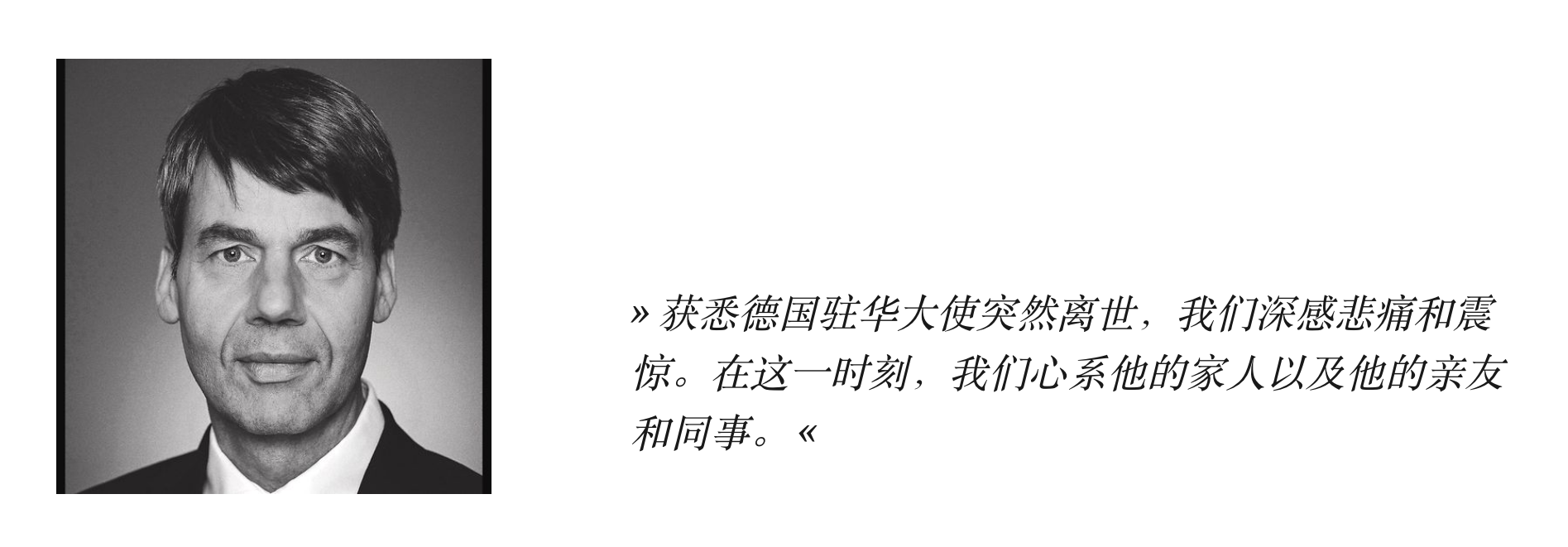 德国外交部没有披露贺岩去世的具体原因。官方声明写道,“获悉德国驻华大使突然离世,我们深感悲痛和震惊。在这一时刻,我们心系他的家人以及他的亲友和同事。”