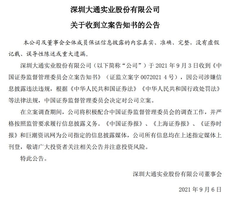 9月6日消息,深大通公告,因公司涉嫌信息披露违法违规,证监会决定对公司立案。