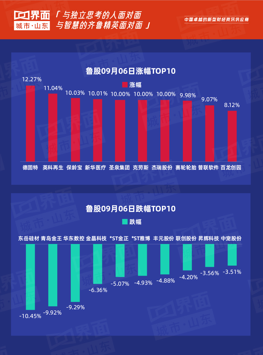 9月6日,A股三大股指集体上涨。截至收盘,沪指涨1.12%,深证成指涨2.59%,创业板指涨4.06%。盘面上,医药、煤炭、证券、酿酒等板块涨幅居前,CRO概念、北交所概念、盐湖提锂等板块走高,有机硅、工业母机等板块回调。两市成交额超14000亿元。受大盘影响,9月06日,山东162只股上涨,79只股下跌,德固特领涨。