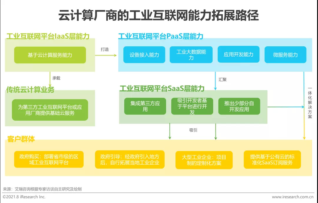 任何工业互联网平台的运行都需要云计算作为底层基础设施进行支撑,这也给云计算厂商在发展工业互联网业务时带来了一个得天独厚的优势。云计算厂商充分利用自身传统资源优势,在过硬的IaaS层能力上打造自身工业互联网平台的PaaS层,通过完善和提升PaaS层能力为与第三方应用开发厂商的合作奠定基础,并吸引更多的独立开发者基于平台能力进行应用开发,以期望能够为平台源源不断地汇聚SaaS层能力,进而形成自身成熟的工业互联网生态。