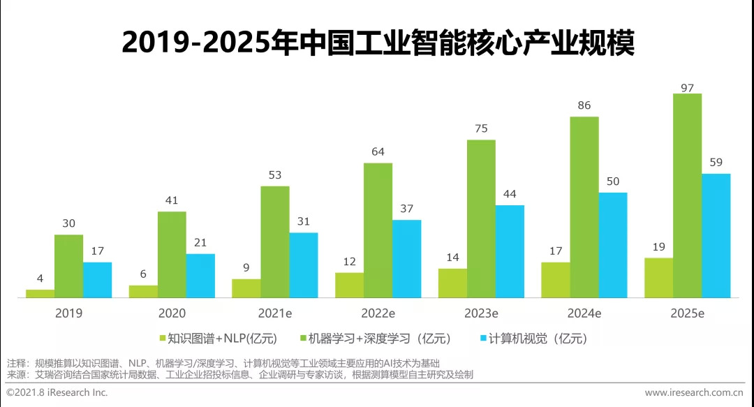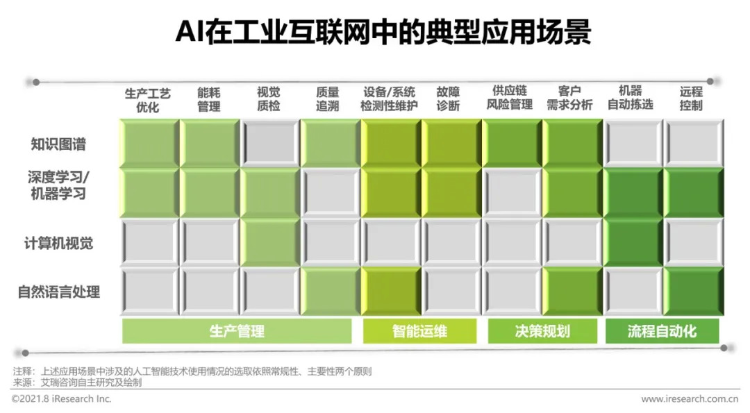 工业互联网的核心是数据驱动的智能分析与决策优化,人工智能技术从广义上来看正是一种通过算法模型对数据的处理方式,人工智能技术因此开始进入工业互联网产品建设方的视野,成为服务商拉高产品价值的落脚点。以深度学习和知识图谱的为代表的人工智能技术从根本上提高系统建模和处理复杂性、不确定性、常识性等问题的能力,显著提升了工业大数据分析能力与效率,为解决工业各领域诊断、预测与优化问题提供得力工具,进一步扩大了工业互联网平台可解工业问题边界的深度和广度。人工智能驱动的工业数据智能分析支撑工业互联网实现数据价值深挖掘,强化了工业企业的数据洞察能力,成为打通智能制造最后一公里的关键环节。