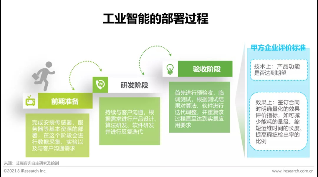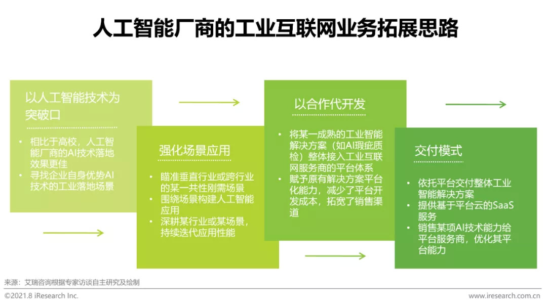 随着《互联网+人工智能三年行动实施方案》、《新一代人工智能发展规划》、《促进新一代人工智能产业发展三年行动计划》等多份国家政策文件的发布,开展人工智能与工业结合应用成为了重要发展趋势。工业领域每个下游行业场景都有其原生的价值链条,同时各个行业的Know – how有着较高的壁垒,人工智能服务商在开展工业领域业务时,大多基于自身技术优势和特点去寻找适合实景落地的垂直细分行业或者某一共通性工业场景,在特定场景应用中持续打磨自身工业智能产品和服务。“聚焦”被大多数AI厂商视为优先的发展策略,通过与成熟的工业互联网平台型企业开展合作,以融入而非自主开发的方式获取平台能力,不仅极大地减少了自研开发的成本和风险,而且为迭代、优化、创新自身工业智能解决方案提供了丰富的资源储备。