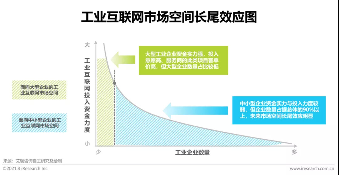 据统计我国中小企业占全部工业企业数量的90%以上,经过近三十多年的发展,中小企业已经成为我国国民经济和社会发展的重要力量,在繁荣经济、增加就业、推动创新、改善民生等方面发挥着越来越重要的作用。然而目前大部分工业互联网服务商还停留在如何服务好龙头企业的层面,忽视了数量更多的中小企业客户和其背后潜在的广阔市场空间。2021年政府工作报告指出,要发展工业互联网,搭建更多共性技术研发平台,提升中小微企业创新能力和专业化水平。共性技术即打造在多个领域内普适的,对产业发展起到根基作用的基础技术,突出通用性、关联性和系统性的特点,切实降低中小企业在创新发展上所需要的资金、时间、试错成本,进而为创新链和产业链相互促进奠定基础。可见我国发展工业互联网不仅仅要着眼于大企业向着更高层次的提升,还要兼顾中小企业信息化、数字化普及,只有推动面向中小企业的工业应用发展,才能真正引领我国工业互联网产业的繁荣。