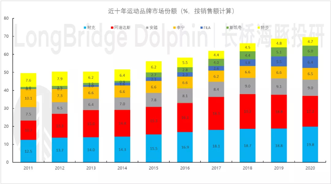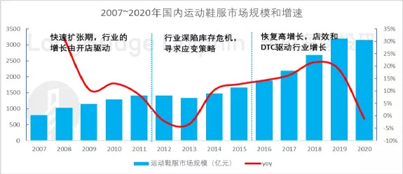 第三阶段,2016~2020年,重回高增长。随着行业库存的清理和国家分别于2014年和2016年出台的一系列利好体育产业的政策推行,运动行业恢复高增长,行业扩张也从以往的跑马圈地式开店转为注重店效提升,主要品牌商业纷纷开始DTC转型(直面消费者),增加电商和线下直营业务的占比。