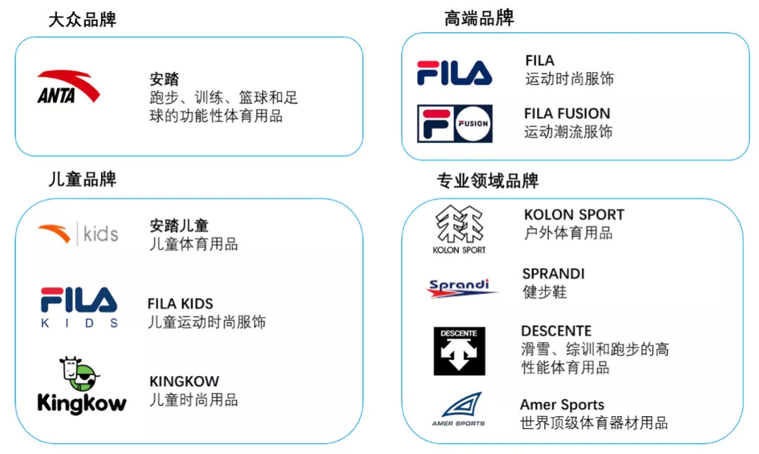 目前安踏体育旗下主品牌安踏定位大众市场,满足中低层级市场对高性价比运动产品的需求, Fila、Fila Fusion等品牌则迎合中高端市场对产品时尚潮流、功能性的诉求,KOLON、Amer等品牌主要深耕户外运动专业领域。